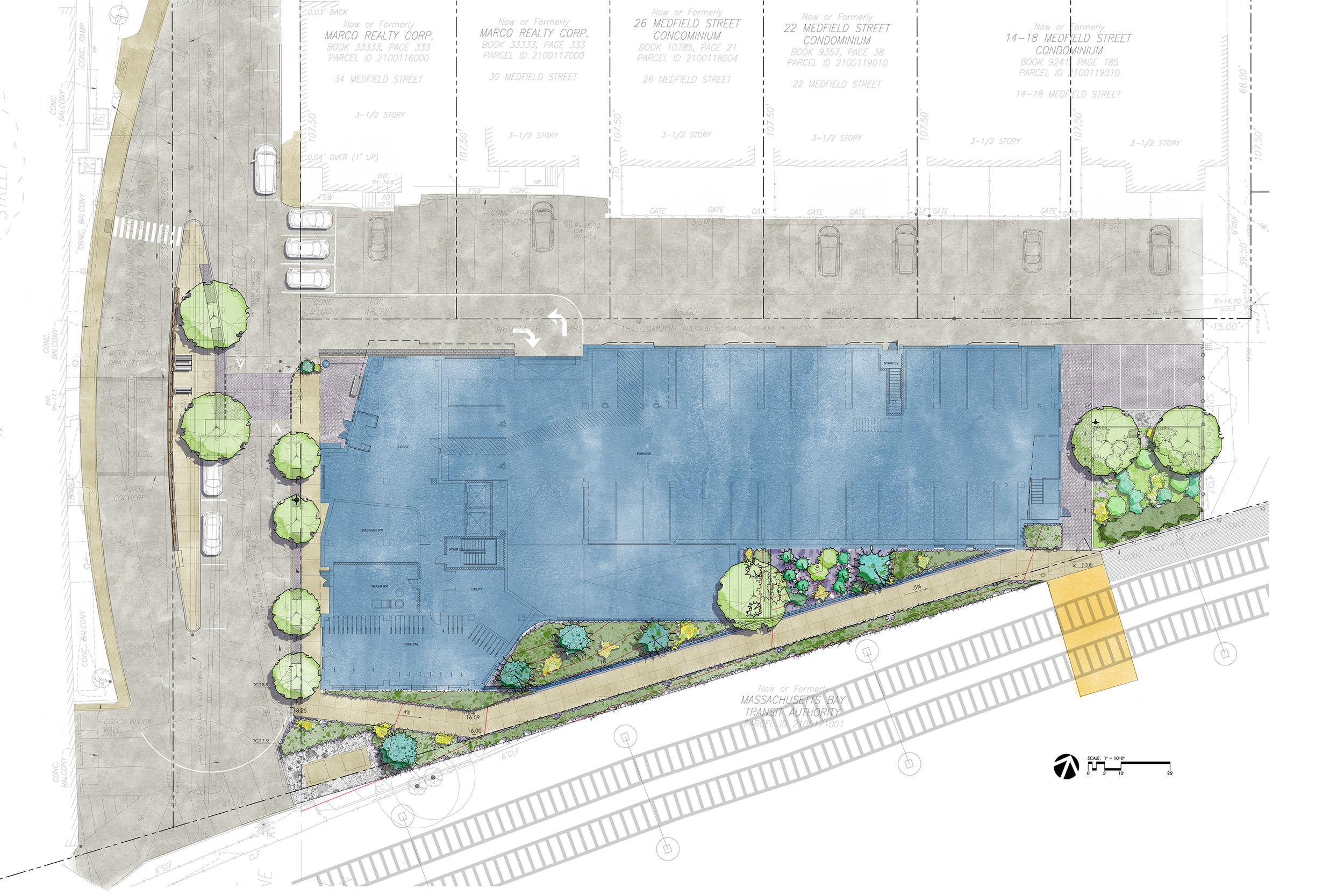 Parking access and service areas are carefully integrated to minimize visual impact and maintain a pedestrian-friendly environment. The landscape design balances functionality with character—supporting resident needs while contributing to the evolving streetscape of St. Mary’s Street.